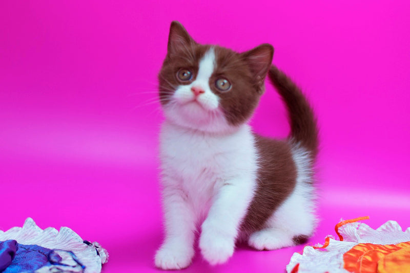 Quira is a female British Shorthair cat showcasing a distinctive chocolate bicolour coat. Her plush, dense fur and well-rounded features embody the classic British Shorthair traits, combining a sturdy build with a calm, affectionate temperament. This beautiful chocolate bicolour pattern adds a unique charm, making Quira an exceptional example of her breed for enthusiasts and connoisseurs alike.