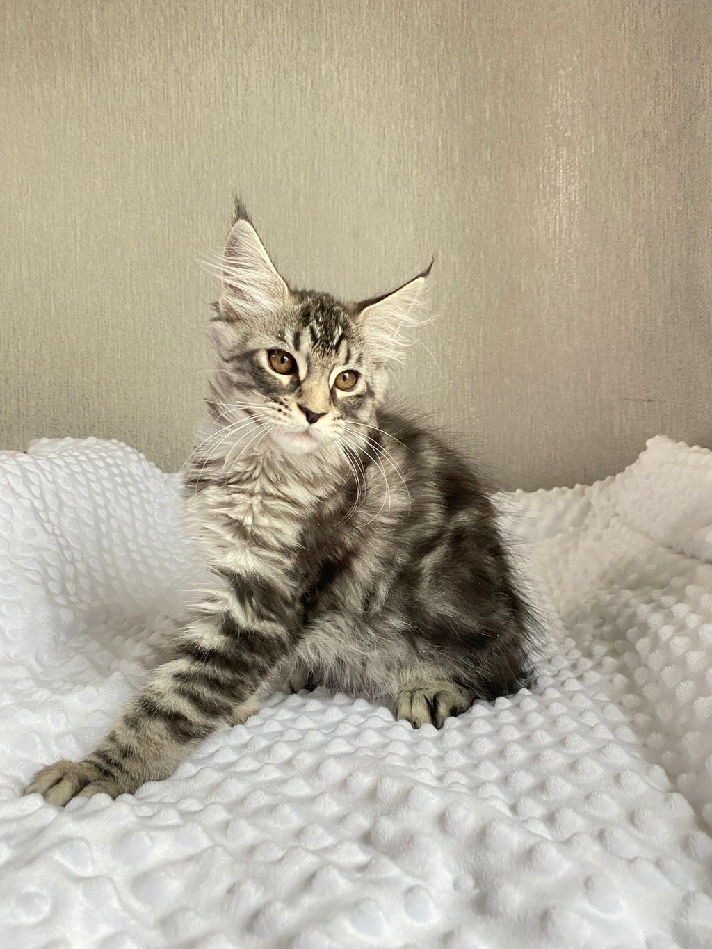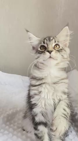 The Quokka Maine Coon female in black silver tabby showcases the breed’s hallmark traits: a robust, muscular build paired with a luxurious, thick coat marked by striking silver tabby patterns. Known for their gentle yet intelligent temperament, these cats make affectionate and adaptive companions. This female offers the ideal combination of classic Maine Coon size and the captivating contrast of black and silver tabby fur, appealing to owners seeking both beauty and breed authenticity. Perfectly suited for families wanting an expert-known, sociable feline with an impressive presence.
