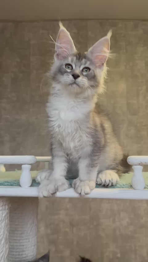 Meet Rachel, a stunning Maine Coon female with the breed's signature grandeur and gentle temperament. Her striking black silver ticked tabby coat displays intricate patterns that highlight the natural beauty Maine Coons are known for. As a polydactyl, Rachel carries the distinctive trait of extra toes, a characteristic found in some of the breed's finest lines. Her substantial frame, tufted ears, and luxurious fur make her an impressive companion. Rachel combines the Maine Coon's renowned intelligence and affectionate nature with a calm, adaptable personality ideal for families seeking a majestic yet devoted feline friend.