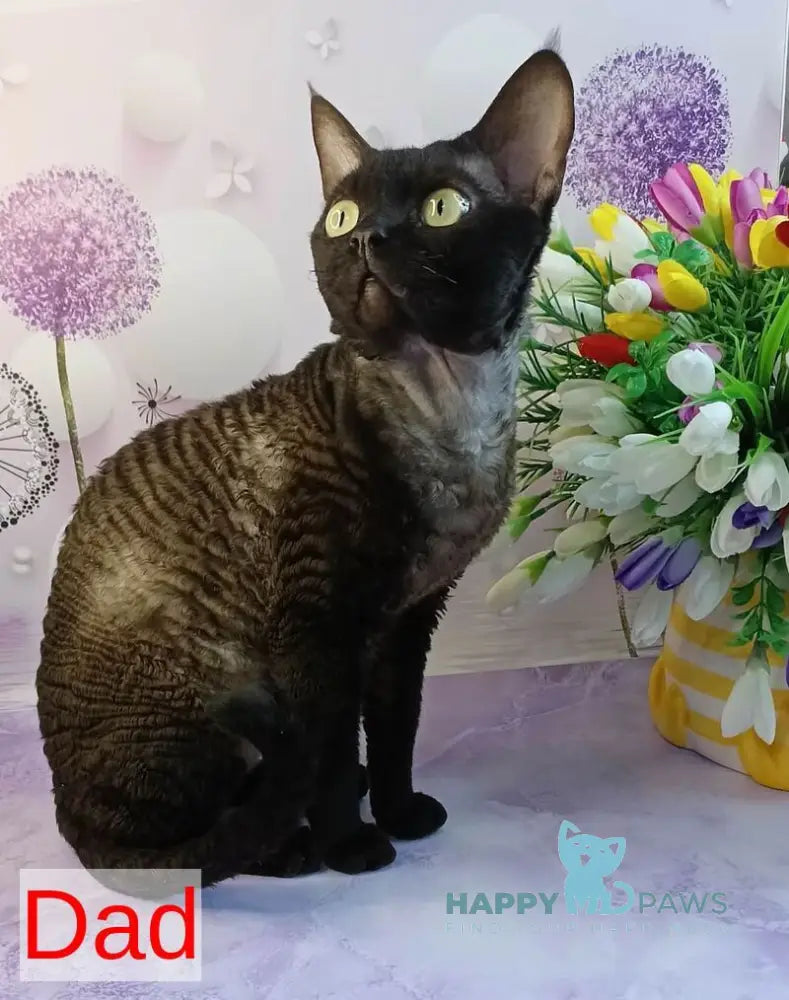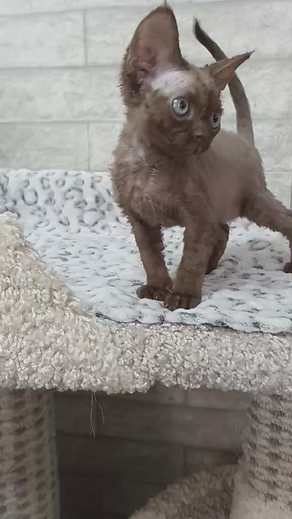 Ramina is a stunning chocolate-colored female Devon Rex, renowned for her distinctive curled coat and elfin features. This breed excels as a devoted companion, offering playful intelligence and an affectionate temperament. Devon Rex cats are exceptionally social and thrive on human interaction, making them ideal for active households. Ramina's luxurious chocolate coloring enhances her elegant appearance, while her naturally wavy fur requires minimal grooming. Known for their warmth and engaging personalities, Devon Rex cats like Ramina form deep bonds with their families and adapt well to various living environments.