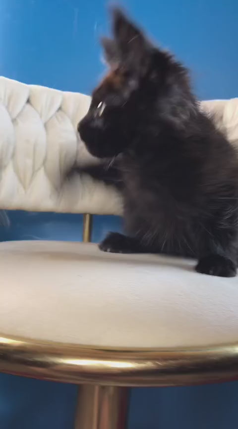 Ramira is a stunning black Maine Coon female, bred for exceptional health and temperament. This majestic breed is renowned for its impressive size, intelligent nature, and affectionate personality. Maine Coons excel as family companions, displaying remarkable loyalty and adaptability to various living environments. Ramira's striking black coat showcases the breed's natural beauty and requires regular grooming to maintain its lustrous appearance. Known for their playful yet gentle demeanor, Maine Coons thrive on interactive engagement and make outstanding additions to households seeking a devoted, sociable feline companion.