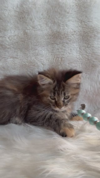 Rita is a stunning Maine Coon female showcasing the classic black tortoiseshell spotted tabby pattern. This breed is renowned for its impressive size, intelligent temperament, and striking appearance. Maine Coons are known for their gentle, sociable nature and adaptability to family environments. Rita's distinctive coloring—a rich blend of black and warm tortoiseshell tones with defined tabby markings—makes her a visually captivating companion. As a Maine Coon, she likely possesses the breed's characteristic traits: a muscular build, tufted ears, a luxurious semi-long coat, and an engaging personality. Ideal for those seeking a majestic, affectionate feline with both beauty and substance.