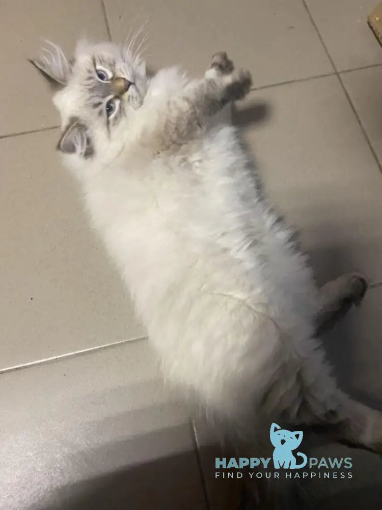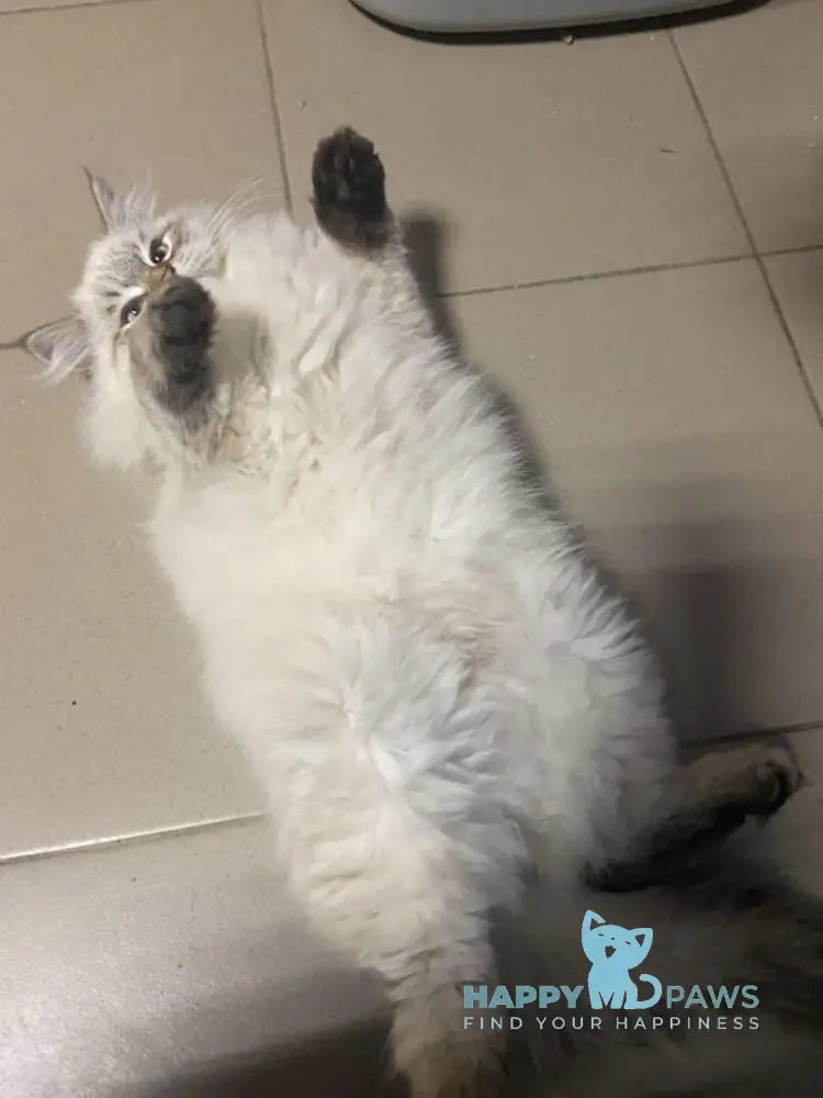 Meet Romeo, a stunning Neva Masquerade male with striking blue pointed coloring. This breed combines the robust build and intelligence of Siberian cats with the elegant color-point pattern reminiscent of Siamese heritage. Romeo displays the characteristic blue-gray coat with darker points on his face, ears, and paws, creating a sophisticated appearance. Known for their gentle temperament and playful nature, Neva Masquerade cats form strong bonds with their families while maintaining an independent spirit. Romeo's semi-long, water-resistant coat requires regular grooming to maintain its lustrous quality. Ideal for families seeking a loyal, affectionate companion with striking good looks and a calm demeanor.