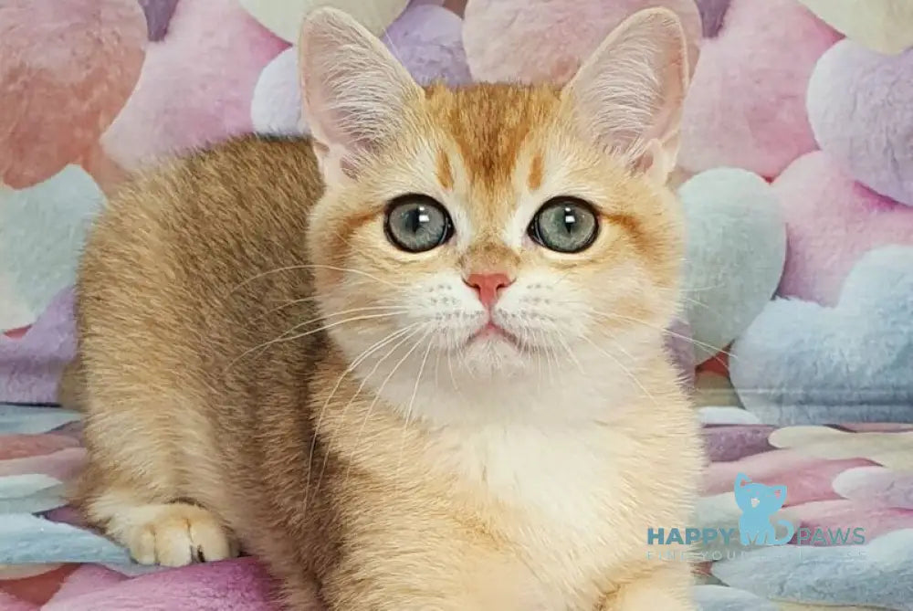 The Ruzana British Shorthair female in black golden shaded features the breed’s signature dense, plush coat with a luxurious golden overlay that adds depth and warmth to her classic black fur. This cat combines the British Shorthair’s stocky build and calm temperament, making her both a striking and affectionate companion. Ideal for feline enthusiasts seeking a breed known for its balanced demeanor and regal appearance, she offers a blend of beauty and gentle personality suited for a sophisticated household.