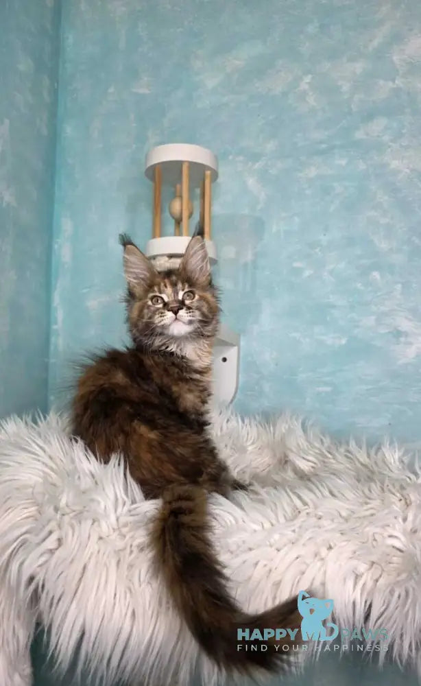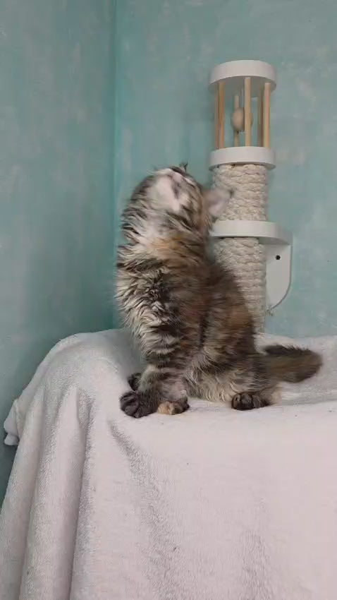 Meet Safari, a stunning female Maine Coon with a captivating black tortoiseshell and white tabby coat. This majestic breed is renowned for its impressive size, intelligent temperament, and affectionate nature. Safari combines the Maine Coon's legendary loyalty with a striking tri-color pattern that showcases nature's artistry. Ideal for families seeking a gentle giant with a playful spirit and strong bonds with their humans. Maine Coons thrive in interactive environments where their curious minds and social personalities can flourish.
