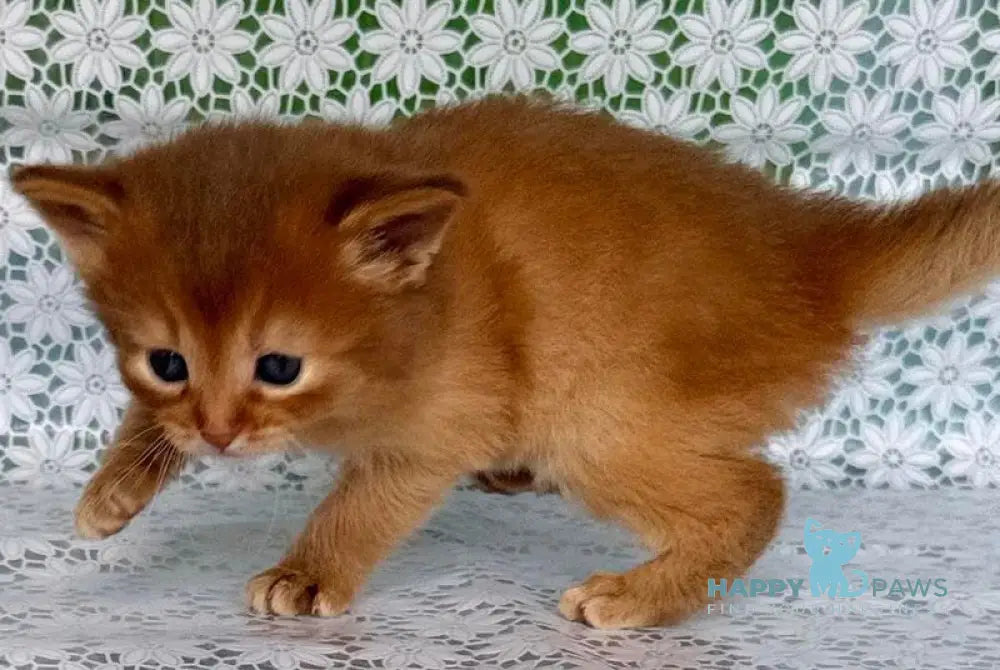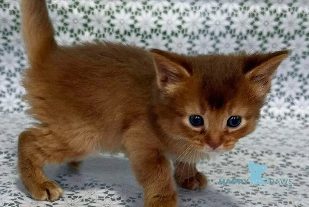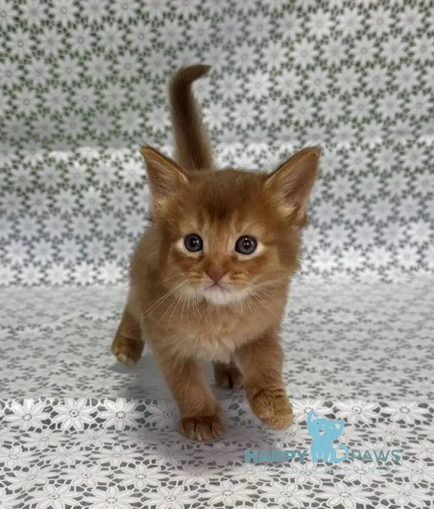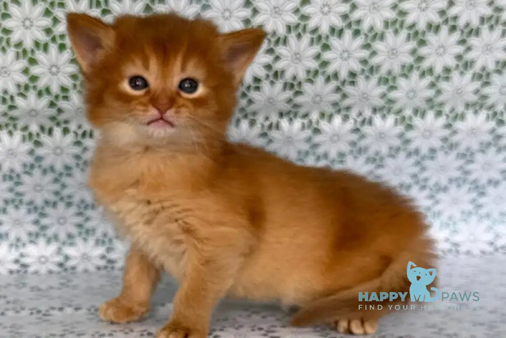 Meet Sakura, an exquisite Somali female with a stunning sorrel coat. This elegant feline showcases the breed's signature ticked pattern in warm, reddish-brown tones that shimmer with natural beauty. Somalis are known for their athletic build, alert intelligence, and affectionate temperament, making them ideal companions for active households. Sakura combines the breed's characteristic grace with a gentle, engaging personality. Her sorrel coloring is particularly prized among enthusiasts for its rich, luminous quality. Whether you're seeking a devoted companion or show-quality addition to your breeding program, Sakura represents the finest qualities of the Somali breed.