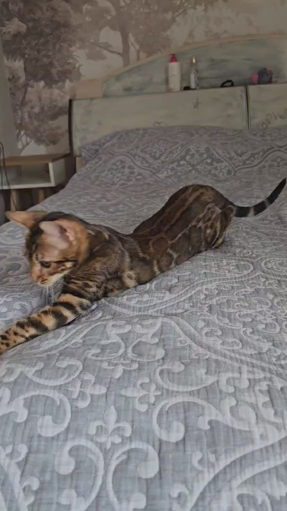 Meet Shakira, a stunning black spotted tabby Bengal female with the distinctive markings and athletic build that define this remarkable breed. Bengals are known for their wild appearance combined with domesticated temperament, making them captivating companions for experienced cat enthusiasts. Shakira displays the characteristic rosette or spotted coat pattern that Bengal breeders prize, along with the breed's characteristic muscular frame and alert intelligence. These cats are highly interactive, playful, and form strong bonds with their families. Bengal females typically make excellent mothers and bring dynamic energy to any household. If you're seeking a beautiful, intelligent feline with an engaging personality and striking appearance, Shakira represents the best of what this exceptional breed has to offer.