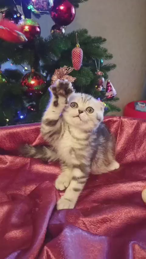 Meet our stunning Silver Scottish Fold male with a striking black silver tabby coat. This exceptional kitten showcases the breed's signature folded ears and round, expressive eyes that capture hearts instantly. His luxurious silver-tipped fur displays beautiful tabby markings, creating a sophisticated appearance. Scottish Folds are known for their gentle, affectionate temperament and adaptability to family life. This male kitten is socialized, healthy, and ready to become a cherished companion. Perfect for those seeking an intelligent, playful cat with a calm demeanor and distinctive aesthetic appeal.