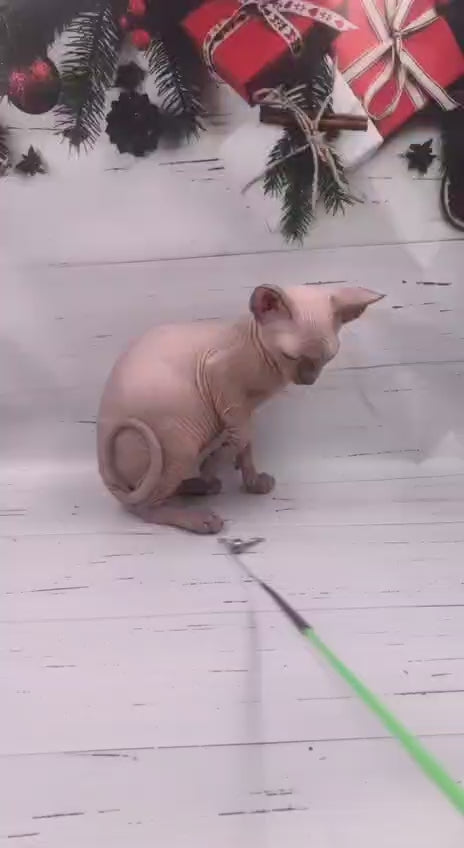Meet Slote, a striking blue pointed Canadian Sphynx male with the breed's signature hairless elegance and distinctive coloring. This exceptional specimen showcases the refined features characteristic of quality Sphynx breeding—alert eyes, prominent ears, and the breed's naturally warm, suede-like skin. Blue pointed markings create a sophisticated contrast across his face and extremities. Canadian Sphynx males of this caliber make devoted companions for experienced owners who appreciate their playful, affectionate nature and unique care requirements. Ideal for those seeking an intelligent, interactive pet with unmistakable presence and personality.