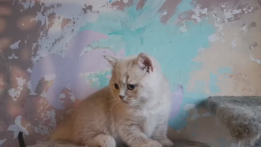 Meet Sofi, a stunning cream-colored British Shorthair female with the breed's signature plush coat and robust build. British Shorthairs are renowned for their calm, easygoing temperament and independent nature, making them excellent companions for families and individuals alike. Sofi displays the characteristic round face, dense double coat, and sturdy frame typical of this beloved breed. Her cream coloring showcases the soft, luxurious texture that British Shorthairs are prized for. Known for their quiet demeanor and adaptability to various living environments, British Shorthairs like Sofi make wonderful indoor pets. These cats are generally healthy, long-lived companions that thrive with moderate play and affection.
