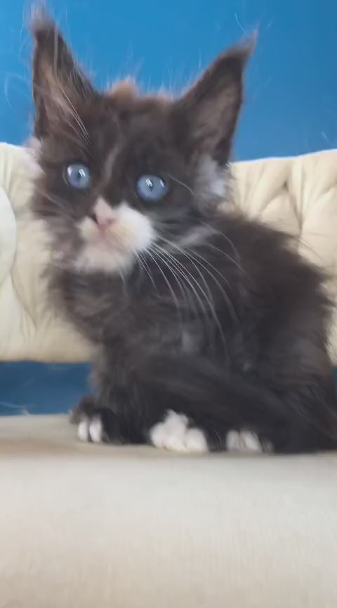 Spark is a striking male Maine Coon displaying the classic black and white coloring that exemplifies this majestic breed. Maine Coons are renowned for their substantial size, intelligent temperament, and gentle disposition, making them exceptional companions for families and experienced cat enthusiasts alike. Spark's distinctive coat pattern showcases the breed's natural beauty, while his Maine Coon heritage promises a loyal, playful personality with a tendency toward social interaction. These cats thrive in environments where they can exercise their natural climbing and hunting instincts. Ideal for those seeking a large, affectionate feline with impressive presence and engaging character.