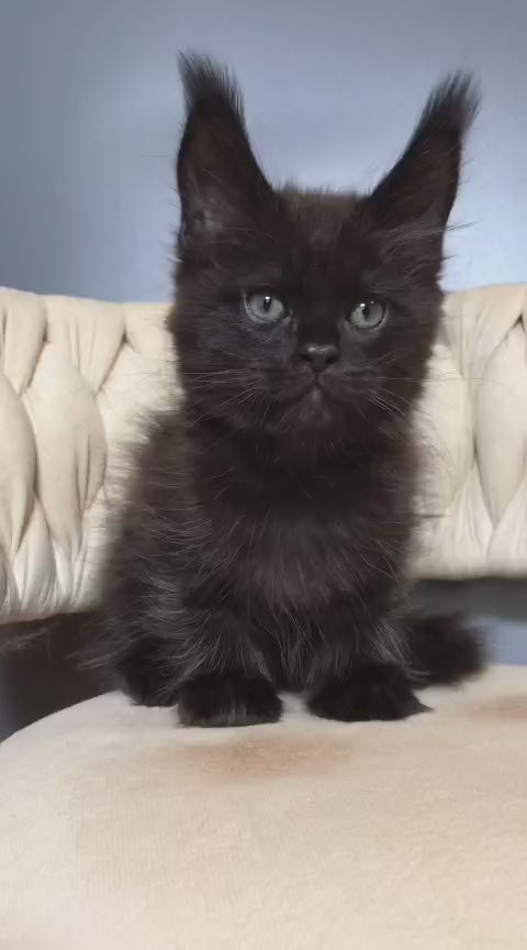 Meet Taiger, a stunning black Maine Coon male with the majestic presence this breed is known for. Maine Coons are celebrated for their impressive size, intelligent personalities, and gentle temperament, making them exceptional companions for families and individuals alike. Taiger combines the breed's characteristic tufted ears, bushy tail, and muscular build with a striking dark coat. These sociable cats thrive on interaction and are known for their playful, affectionate nature. Perfect for those seeking a loyal, engaging feline friend with plenty of personality and charm.
