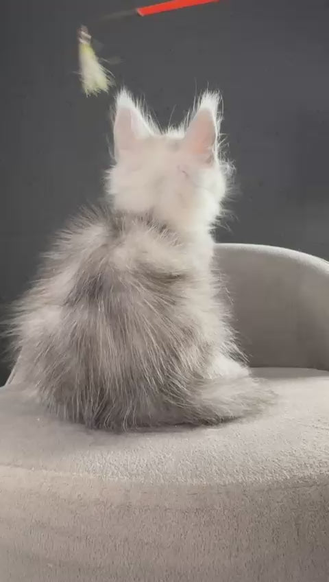 Meet Taimyr, an exceptional Maine Coon male showcasing the striking black silver shaded coat pattern. This majestic breed exemplifies the Maine Coon's renowned characteristics: impressive size, muscular build, and intelligent temperament. Taimyr's luxurious fur displays the sophisticated interplay of black and silver tones that define the shaded variety, creating a captivating appearance. Maine Coons are celebrated for their gentle disposition, playful nature, and adaptability to family life. As a pedigreed male, Taimyr represents the breed standard's finest qualities, making him an outstanding choice for discerning feline enthusiasts seeking a companion with both beauty and personality.