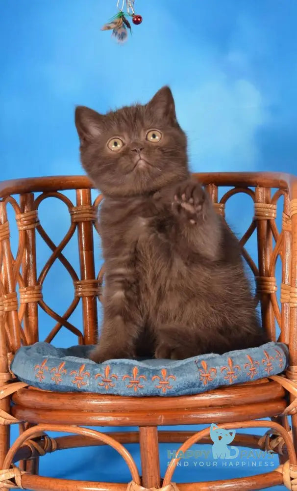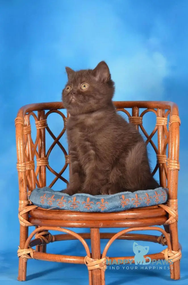 Tamila is a stunning Scottish Straight female with a luxurious chocolate coat that showcases the breed's signature plush texture and elegant appearance. Known for their calm temperament and affectionate nature, Scottish Straights make exceptional companions for families and individuals seeking a devoted feline friend. Her striking eye color and well-proportioned features exemplify breed standards. This beautiful girl thrives in environments where she receives consistent attention and interactive play. Perfect for those who appreciate a graceful, intelligent cat with a gentle disposition and striking good looks.