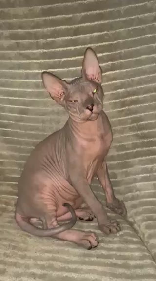 Meet Taylor Don, a striking male Sphynx with a captivating black spotted tabby pattern. This hairless breed showcases the distinctive wrinkled skin and large ears characteristic of Sphynx cats, combined with bold tabby markings that enhance his unique appearance. Known for their warmth-seeking nature and affectionate temperament, Sphynx cats like Taylor Don thrive on human companionship and make devoted family members. Their lack of fur requires regular bathing and sun protection, but rewards owners with a truly one-of-a-kind feline companion. Perfect for those seeking an intelligent, interactive cat with striking visual appeal.