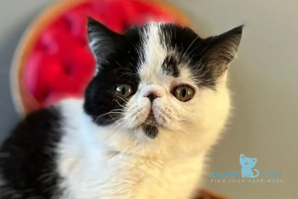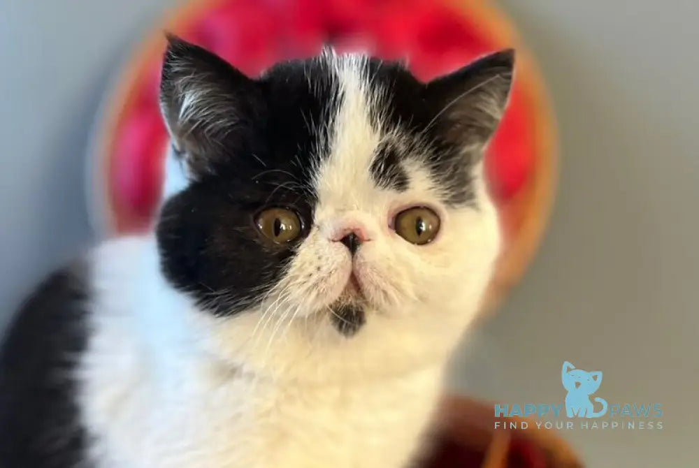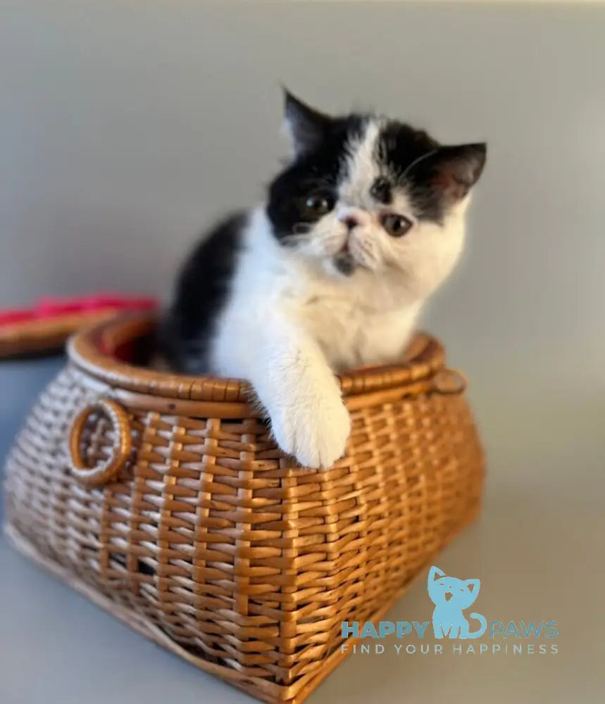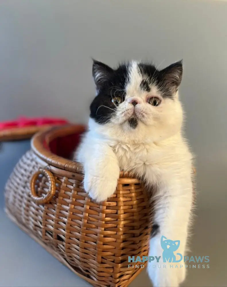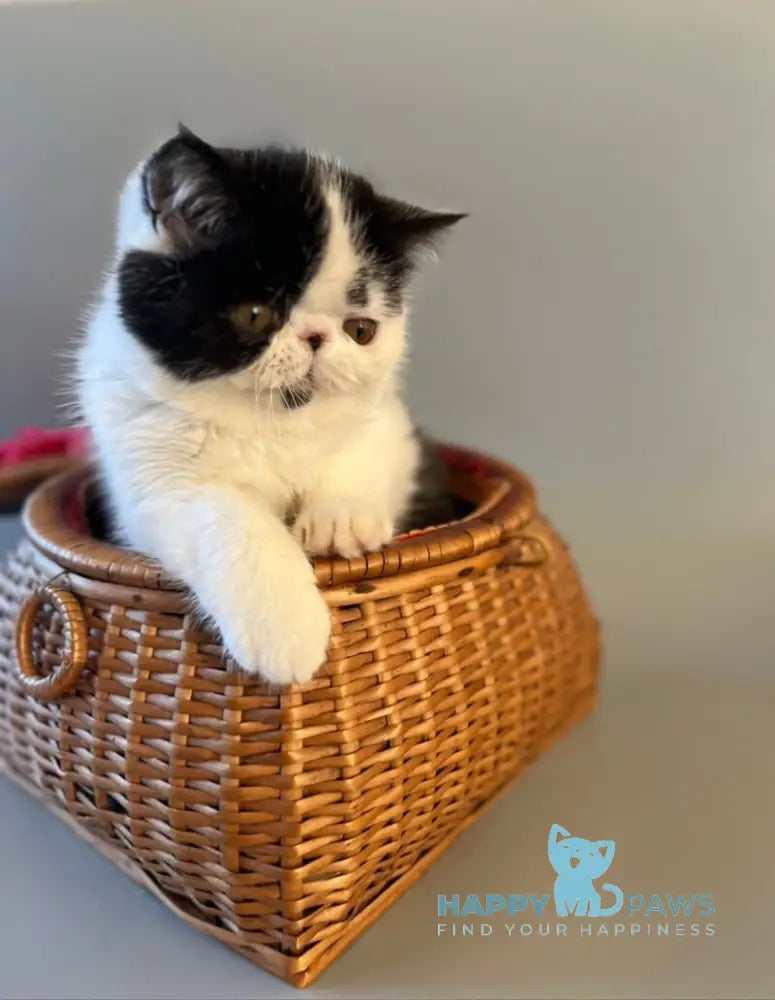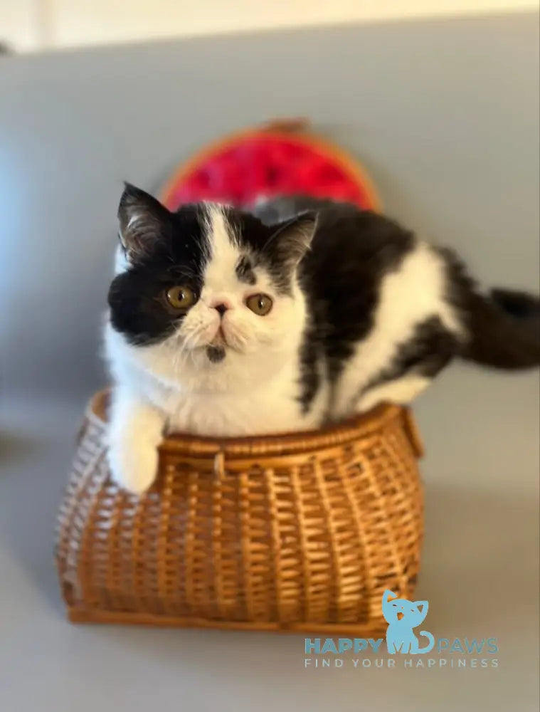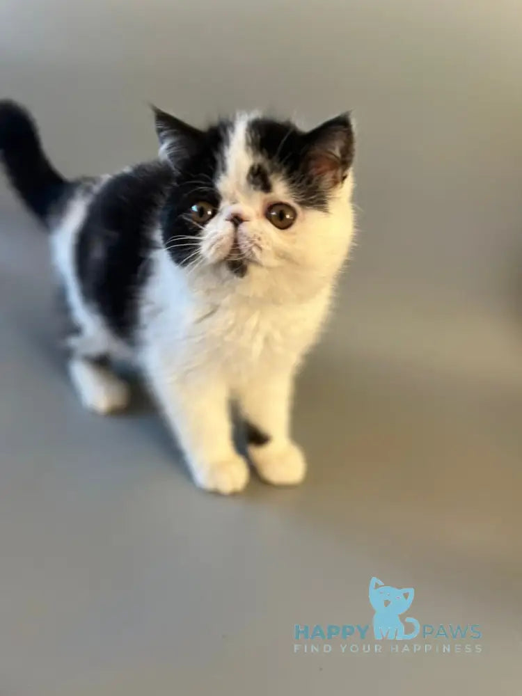Teo is a striking black bicolour exotic male with the distinctive features that define the breed. His rich black coat contrasts beautifully with white markings, creating the classic bicolour pattern prized by exotic enthusiasts. This male exhibits the characteristic flat face, round eyes, and compact build that make exotics so appealing. Ideal for breeders and show enthusiasts seeking quality genetics, Teo combines aesthetic excellence with proven lineage. His temperament and conformation make him an exceptional addition to any breeding program or as a cherished companion for those who appreciate the exotic breed standard.