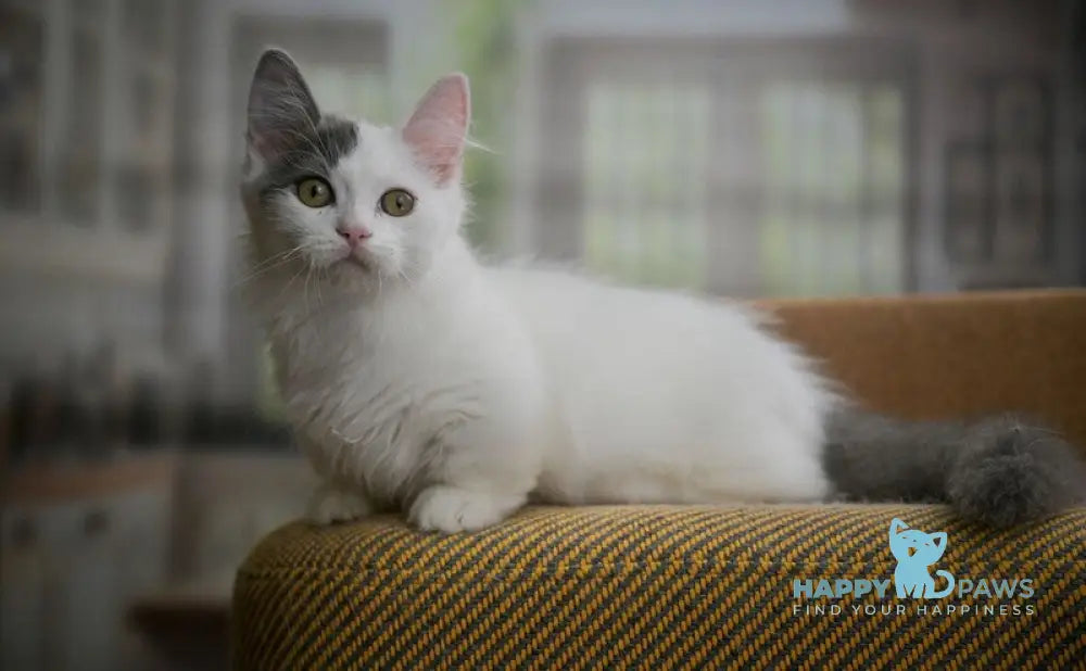 Teodoro is a striking male Munchkin cat with a distinctive blue van coat pattern. This rare coloring features a predominantly white body with blue-gray patches concentrated on the head and back, creating an eye-catching appearance. Known for their characteristically short legs, Munchkins like Teodoro maintain surprising agility and playfulness despite their compact stature. His blue van markings are particularly prized among feline enthusiasts for their unique aesthetic appeal. Teodoro combines the breed's signature charm with an impressive visual presence, making him an exceptional addition to any household seeking a distinctive and engaging companion.