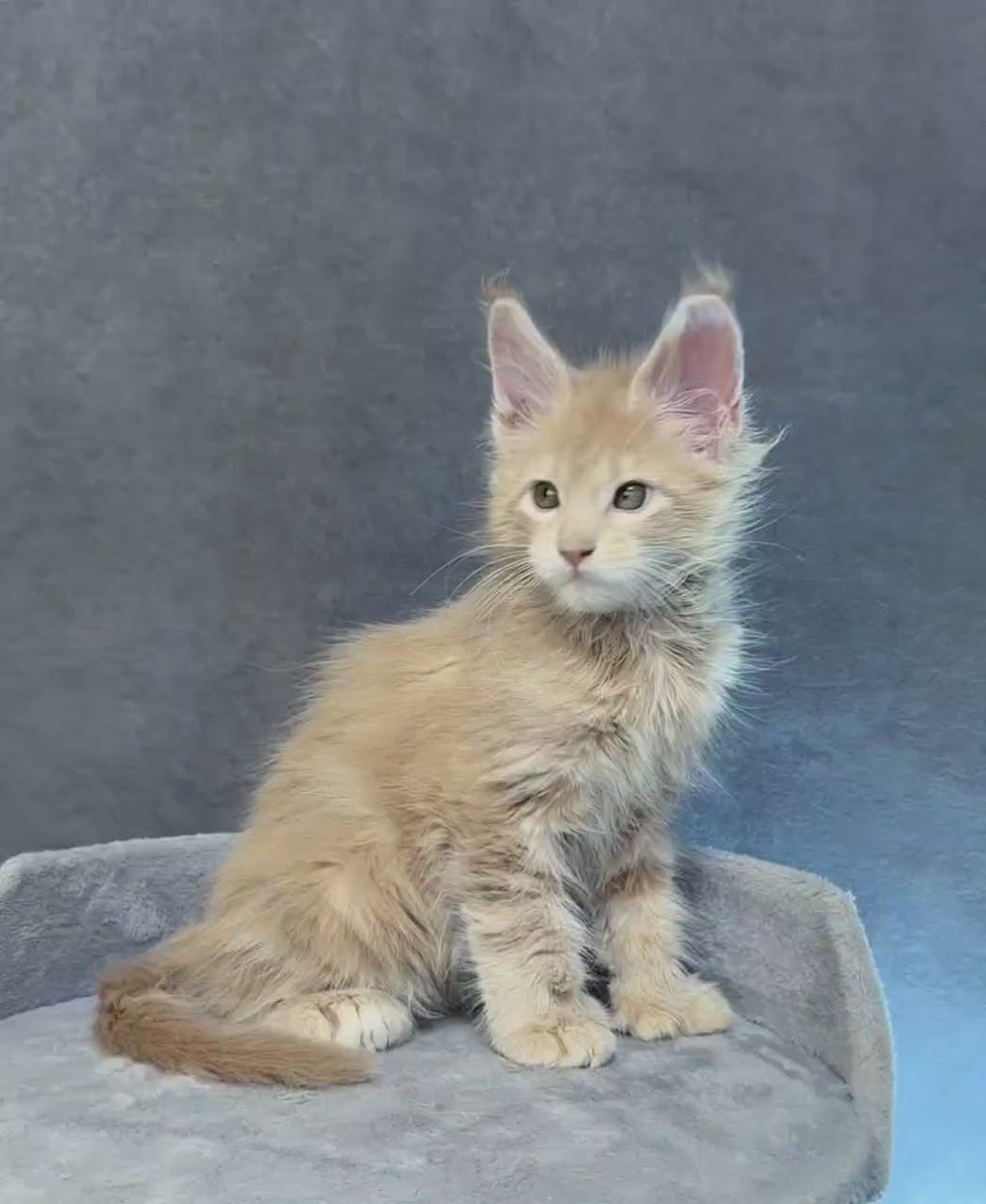 Triumph is a striking Maine Coon male showcasing the breed's impressive stature and distinctive features. His cream tabby coat displays the classic swirled patterns characteristic of the tabby designation, complemented by his substantial build and tufted ears. As a polydactyl, Triumph possesses the extra toe pads that add to his unique appeal and are a celebrated trait within Maine Coon enthusiast circles. His temperament reflects the breed's renowned intelligence and sociability, making him an excellent choice for those seeking a companion with both striking aesthetics and engaging personality. Triumph represents premium Maine Coon genetics and distinctive polydactyl heritage.