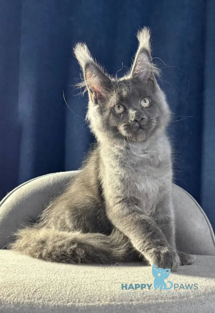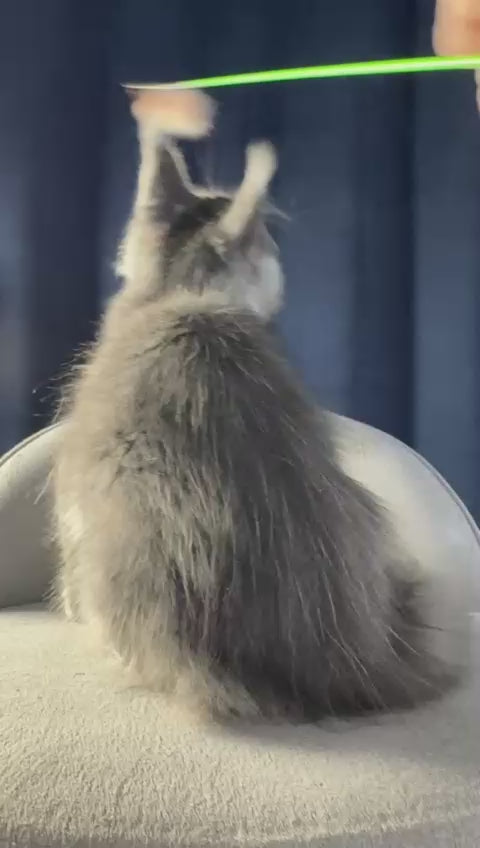 Ukka is a stunning blue silver Maine Coon female, renowned for her striking coat color and majestic presence. Maine Coons are celebrated for their gentle temperament, intelligence, and affectionate nature, making them exceptional companions. Ukka's distinctive blue silver coloring showcases the breed's natural elegance and beauty. These large, muscular cats are known for their playful personalities, adaptability to family life, and loyal bonds with their owners. Perfect for those seeking a remarkable feline companion with both beauty and charm.