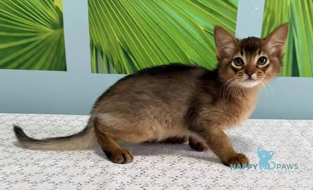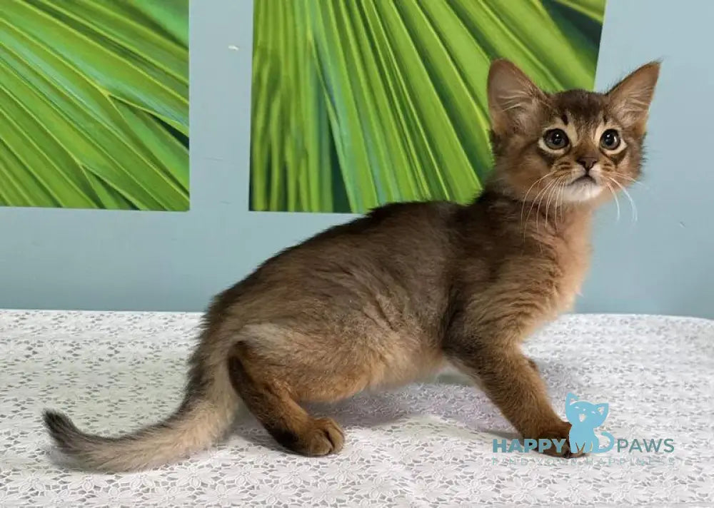 Meet Ukrop, a stunning ruddy Somali male with the breed's signature elegance and athleticism. This handsome boy displays the warm, burnt-orange coat that defines the ruddy coloration, complemented by his alert expression and graceful build. Somalis are known for their intelligence, playfulness, and devoted companionship. Ukrop combines these traits with a calm, sociable temperament, making him an excellent choice for families seeking an engaging and affectionate feline companion. His striking appearance and engaging personality promise years of joy and entertainment.