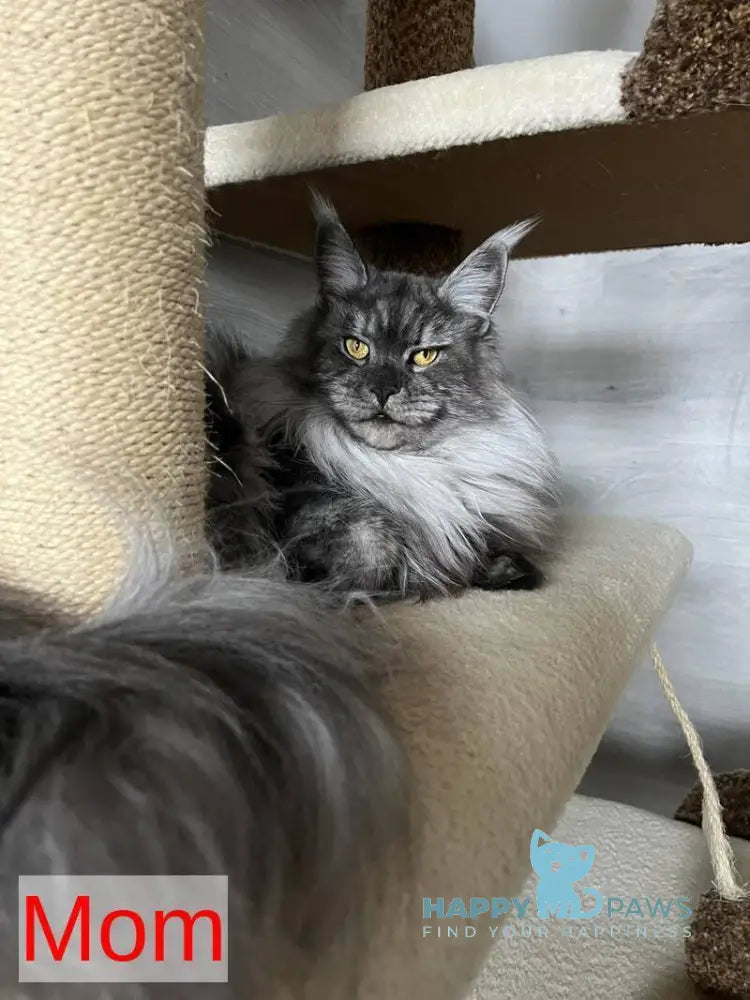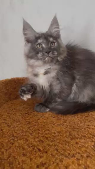 Meet Ulyana, a stunning Maine Coon female with a captivating black tortoiseshell silver coat accented by white markings. This majestic breed is known for its impressive size, gentle temperament, and luxurious long fur. Maine Coons are intelligent, playful companions that thrive on interaction and make wonderful family pets. Ulyana's unique coloring and striking appearance make her a truly special addition to any home. Perfect for those seeking a loyal, affectionate feline friend with personality to spare.