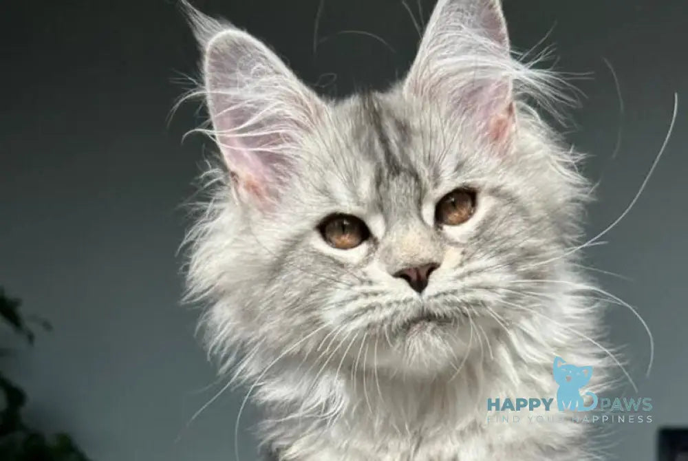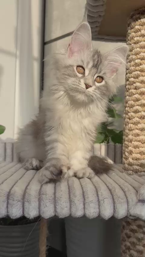 Undina is a stunning Maine Coon female showcasing the breed's most coveted characteristics. Her luxurious black silver tabby coat displays striking contrast and depth, while her polydactyl paws—a distinctive Maine Coon trait—feature extra toes that enhance her impressive stature and climbing ability. Known for their gentle temperament and intelligence, Maine Coons like Undina make exceptional companions. Her substantial size, tufted ears, and bushy tail exemplify breed standards. This remarkable feline combines striking aesthetics with the Maine Coon's renowned affectionate and playful nature, making her an outstanding addition to any household seeking a majestic yet devoted family member.