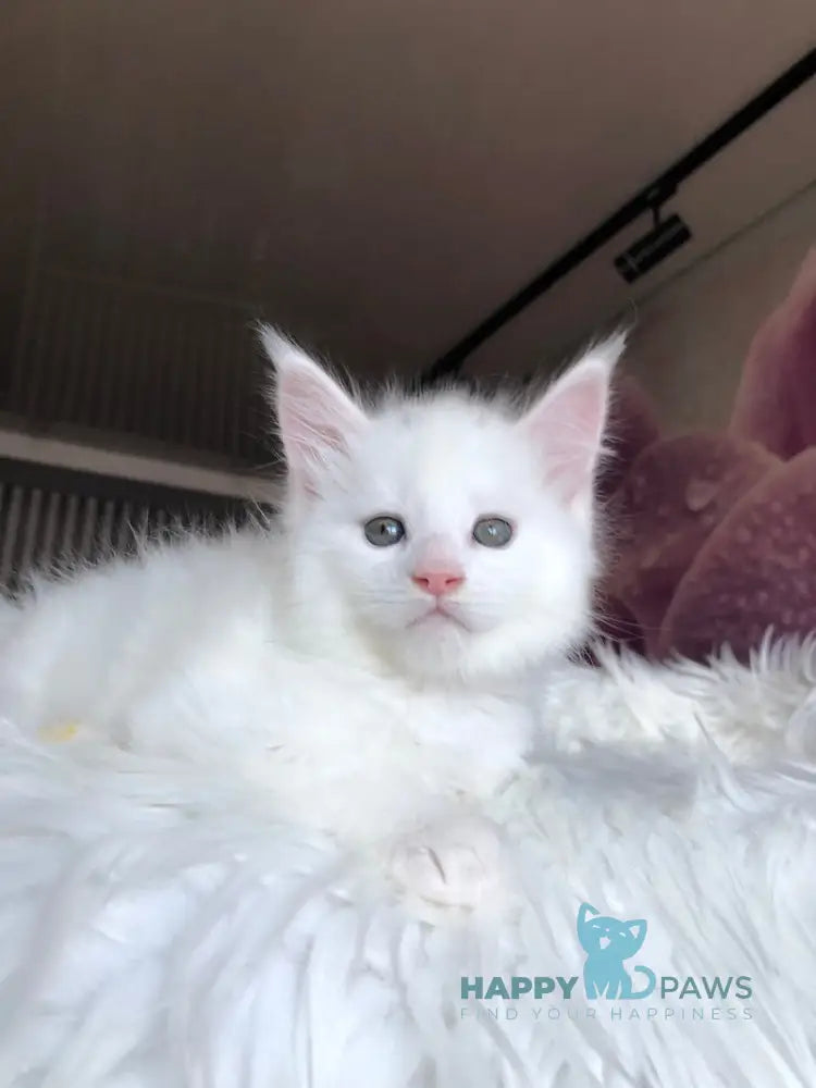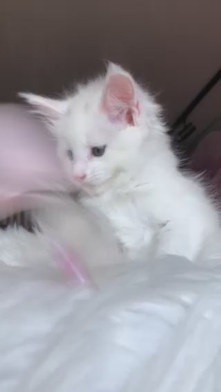Undine is a stunning white Maine Coon female with the breed's signature luxurious long coat and impressive size. Known for their gentle, intelligent nature, Maine Coons make exceptional companions for families and individuals alike. Undine combines the breed's characteristic tufted ears, bushy tail, and muscular build with a striking white appearance. These cats are playful, social, and adaptable, thriving in homes where they receive attention and enrichment. Perfect for those seeking a majestic, affectionate feline friend with a distinctive personality.
