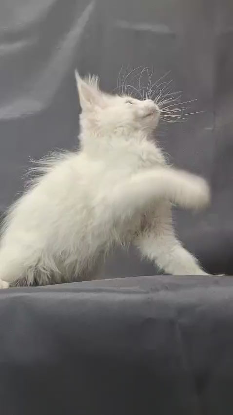 Meet Uslada, a stunning white Maine Coon female with the breed's signature elegance and commanding presence. Maine Coons are renowned for their impressive size, intelligent temperament, and gentle disposition, making them exceptional companions for families and experienced cat enthusiasts alike. Uslada's pristine white coat showcases the breed's luxurious, water-resistant fur and striking features. These cats thrive on interactive play and human companionship while maintaining an independent streak. With proper care, Maine Coons live 12-15 years, offering years of loyal friendship and engaging personality.