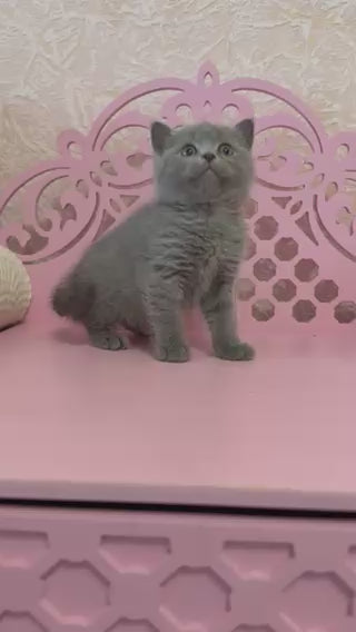Meet Varyusha, a stunning Scottish Straight female with a captivating blue coat. This elegant feline exemplifies the breed's signature traits: a well-proportioned body, rounded features, and those distinctive forward-folded ears that give Scottish Straights their charming expression. Her plush blue-gray fur is dense and luxurious, requiring regular grooming to maintain its pristine appearance.