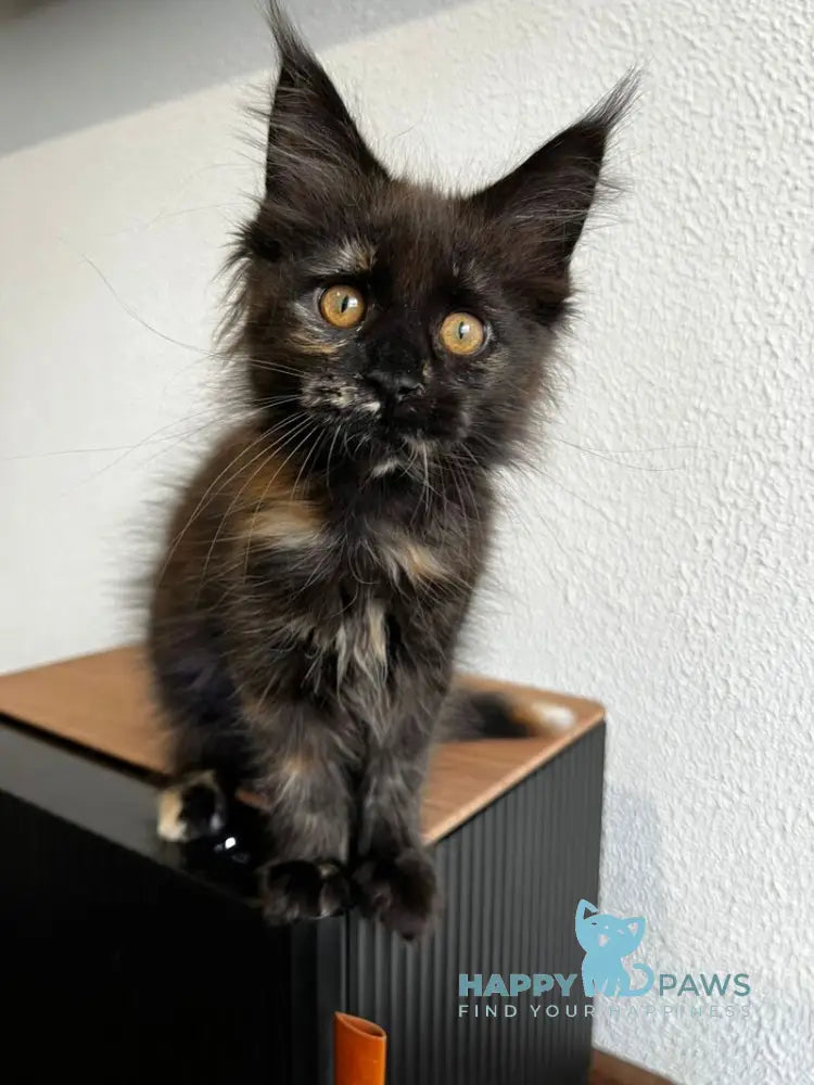 Venus is a stunning female Maine Coon with a distinctive black tortie coat, showcasing the breed’s signature luxurious fur and striking pattern. Known for their gentle temperament and impressive size, Maine Coons like Venus make affectionate and intelligent companions. Her unique coloring highlights the breed’s natural beauty and contributes to her strong, healthy appearance. Ideal for cat enthusiasts seeking a well-bred, majestic pet with a calm and friendly nature.