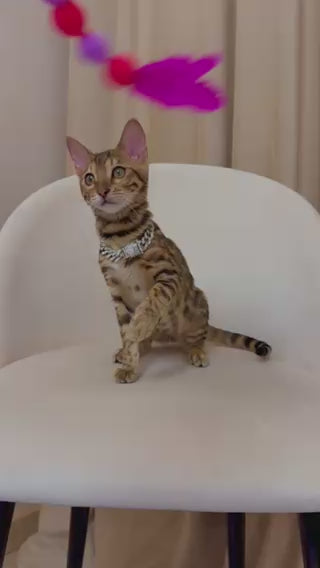 Meet Vesper, a stunning Bengal female with a striking black spotted tabby coat. This beautiful girl showcases the breed's signature wild appearance with bold, high-contrast markings and a sleek, muscular build. Vesper's energetic personality and intelligent nature make her an engaging companion for active households. Her distinctive spotted pattern and graceful movements reflect the Bengal breed's exotic heritage. Perfect for experienced cat owners seeking a playful, affectionate feline with remarkable beauty and personality.