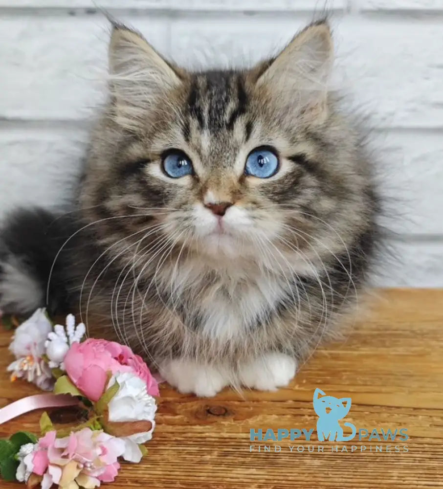 Meet Virginia, a stunning Siberian kitten with a striking seal tabby bicolour coat. This female showcases the breed's hallmark features: a robust build, luxurious semi-long fur, and intelligent, expressive eyes. Siberians are known for their gentle temperament, playful nature, and strong bonds with their families. Virginia is ready to bring warmth, companionship, and spirited personality to her forever home. Each kitten is raised with care to ensure proper socialization and health.