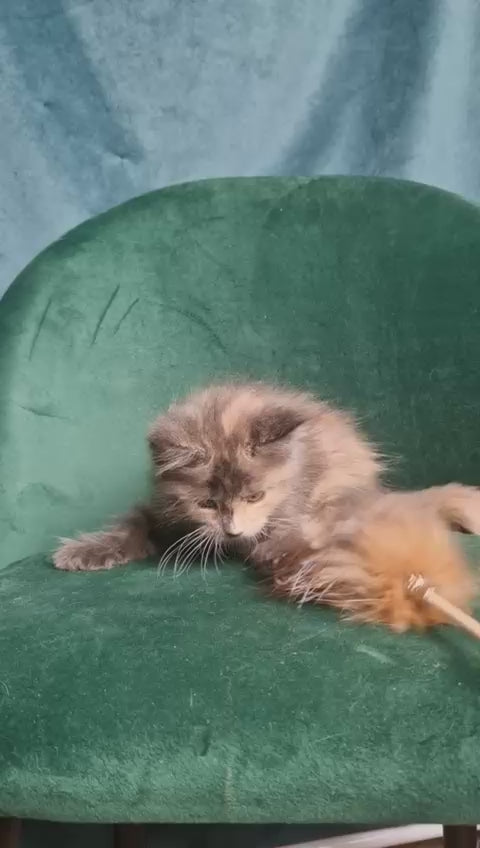 Wendy is a stunning female Maine Coon with a rare blue tortie coat, showcasing the breed’s distinctive tufted ears and expressive eyes. Known for their gentle and intelligent nature, Maine Coons like Wendy make affectionate companions while also exhibiting strong physical resilience. Her unique color pattern coupled with the breed’s characteristic large size and sociable temperament makes her a remarkable addition to any knowledgeable cat enthusiast’s home.