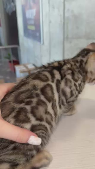 Meet the X-Trimm Bengal male—a striking black spotted tabby with the distinctive wild appearance that makes Bengals so captivating. This breed combines the exotic look of a leopard with a domesticated temperament, featuring bold contrast markings and a sleek, muscular build. Known for their intelligence and athleticism, Bengals thrive with interactive play and mental stimulation. Their luxurious coat requires minimal grooming while maintaining its stunning sheen. Perfect for active households seeking a loyal, engaging companion with an unmistakable presence.