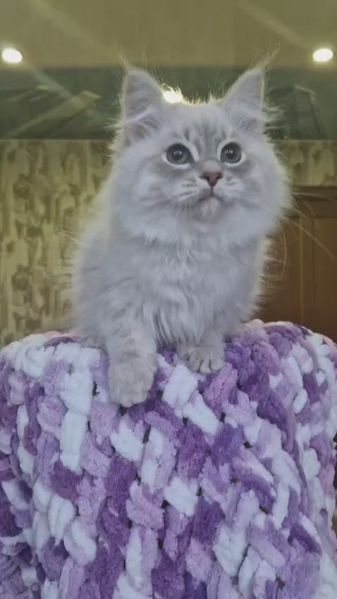 Xenophon represents the pinnacle of Siberian cat breeding, showcasing the breed's most coveted characteristics. This striking male displays the distinctive blue tabby pointed pattern—a sophisticated color variation featuring cool gray-blue tones with elegant tabby markings and darker points on the face, ears, and extremities. Siberians are renowned for their substantial build, muscular frame, and luxurious triple-layered coat designed for harsh climates. Beyond aesthetics, this breed excels as a devoted companion, combining intelligence with a gentle temperament. Xenophon's lineage reflects careful selection for health, longevity, and breed standards. Ideal for discerning feline enthusiasts seeking a majestic, affectionate cat with exceptional pedigree credentials.