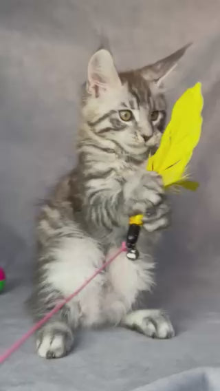Meet Yanki, a striking Maine Coon male showcasing the coveted black silver spotted tabby pattern. This majestic breed combines impressive size with gentle temperament, making him an exceptional companion. Maine Coons are renowned for their intelligence, playful nature, and dog-like loyalty. Yanki's distinctive silver-tipped coat and bold tabby markings highlight the breed's natural beauty. Known for their adaptability and social disposition, Maine Coons thrive in family environments and enjoy interactive play. With proper care, nutrition, and enrichment, Yanki promises years of companionship and entertainment for the right home.