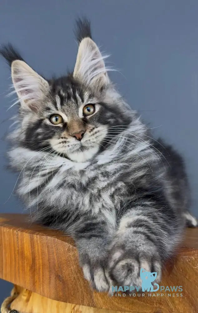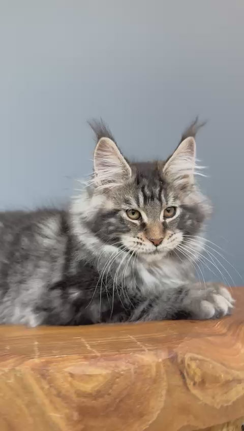 Yelizar is a striking male Maine Coon displaying the coveted black silver tabby pattern. This breed is renowned for its impressive size, muscular build, and gentle temperament, making Maine Coons exceptional companions for families and experienced cat enthusiasts alike. The black silver tabby coloring showcases dramatic contrast and distinctive markings characteristic of the breed standard. Maine Coons are highly intelligent, social, and adaptable cats that thrive in interactive environments. Known for their dog-like loyalty and playful nature, they form strong bonds with their owners while maintaining an independent streak. Their luxurious, water-resistant coat requires regular grooming to maintain its beauty and health. Yelizar represents the finest qualities of this majestic breed.