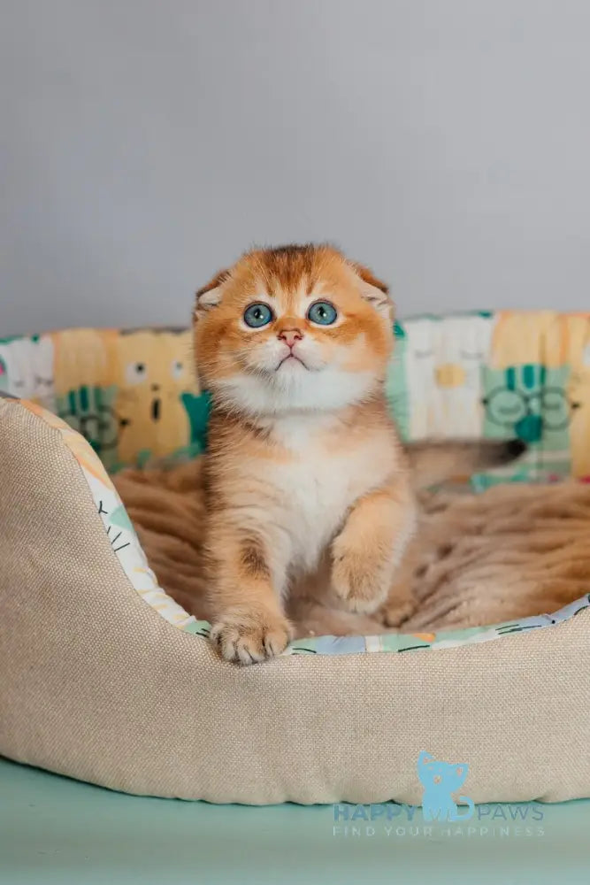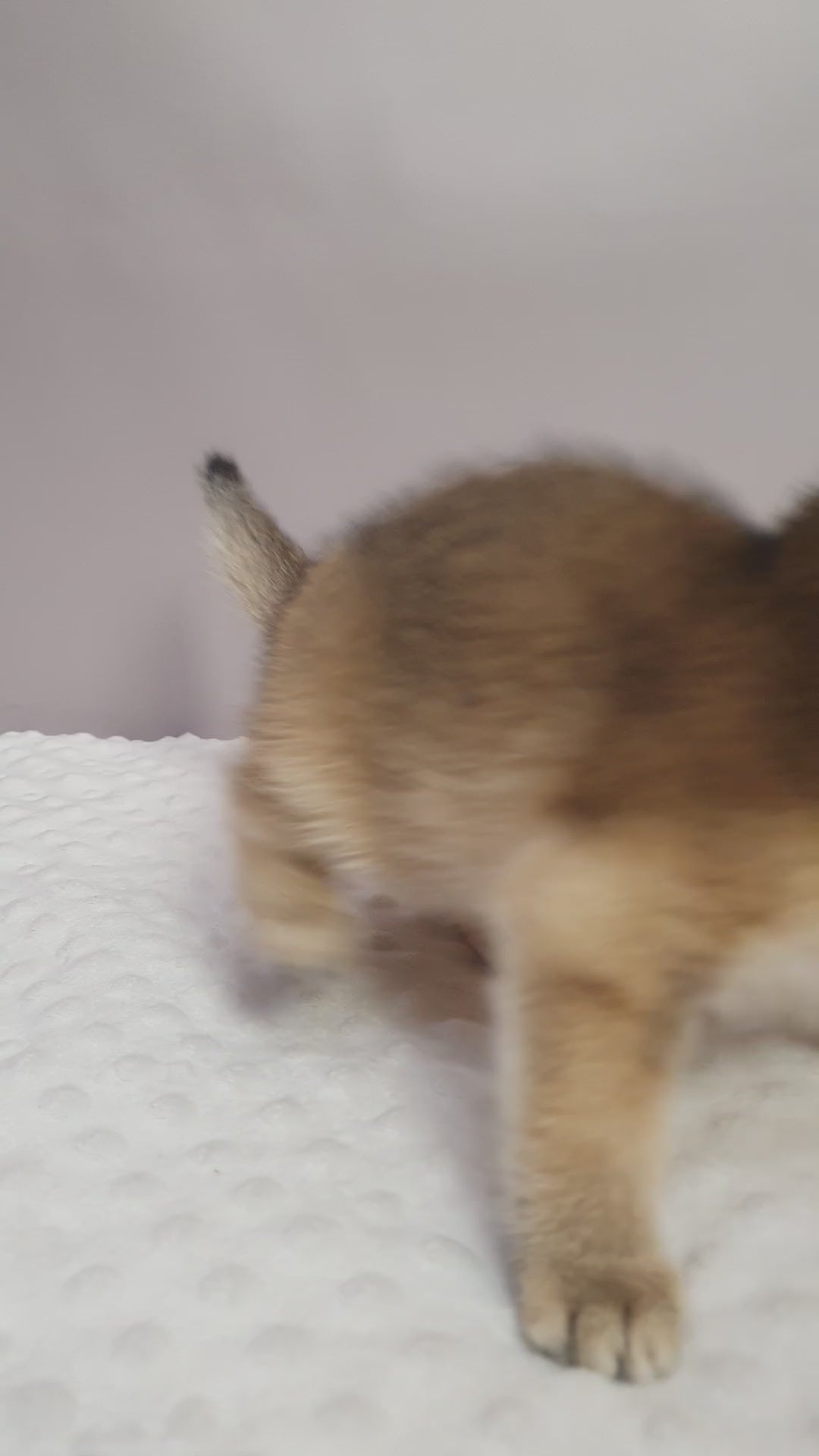 Zefir is a Scottish Fold female with a stunning black golden ticked tabby coat. Her delicate folded ears and warm coloring give her an elegant, soft appearance. She has a gentle, affectionate nature and loves peaceful moments. Zefir’s quiet charm makes her truly captivating.