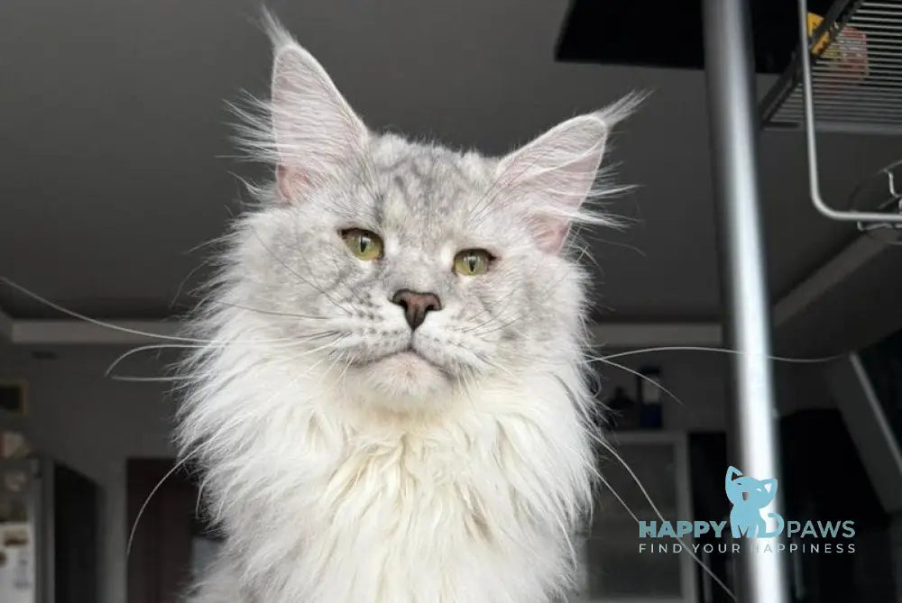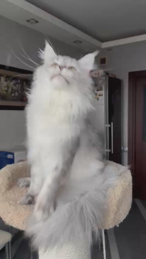 Zenith represents the pinnacle of Maine Coon breeding excellence. This striking male showcases the breed's signature black silver tabby pattern, featuring bold contrast markings against a luminous silver base coat. Maine Coons are renowned for their substantial size, intelligent temperament, and gentle disposition, making them exceptional companions for families and experienced cat enthusiasts alike. Zenith displays the characteristic tufted ears, bushy tail, and muscular build that define this majestic breed. His lineage reflects careful genetic selection for health, conformation, and desirable personality traits. An ideal choice for those seeking a premium pedigree Maine Coon with striking aesthetics and the breed's celebrated companionability.