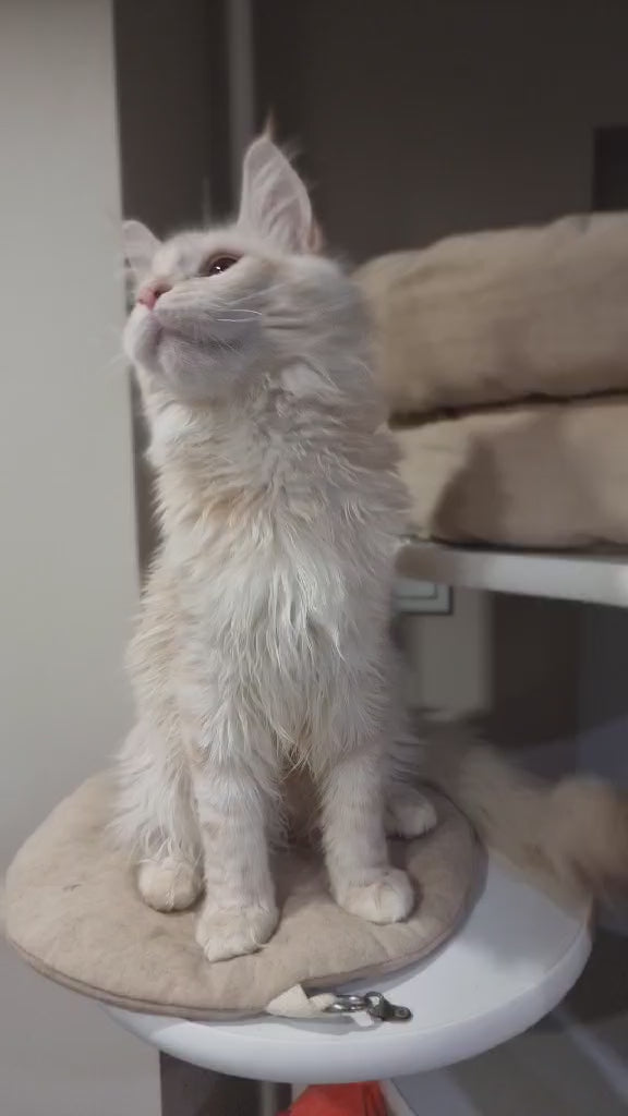 Meet Zeus, a stunning Maine Coon male showcasing the coveted red silver spotted tabby pattern. This majestic breed is renowned for its impressive size, intelligent temperament, and striking appearance. Zeus displays the characteristic Maine Coon features: a muscular build, tufted ears, and a luxurious coat with the distinctive red and silver spotted tabby markings that make him truly exceptional. Maine Coons are known for their gentle, sociable nature and adaptability to family life. With proper care, Zeus will develop into a loyal, affectionate companion who thrives on interaction and play. An excellent choice for those seeking a premium pedigree cat with both beauty and personality.