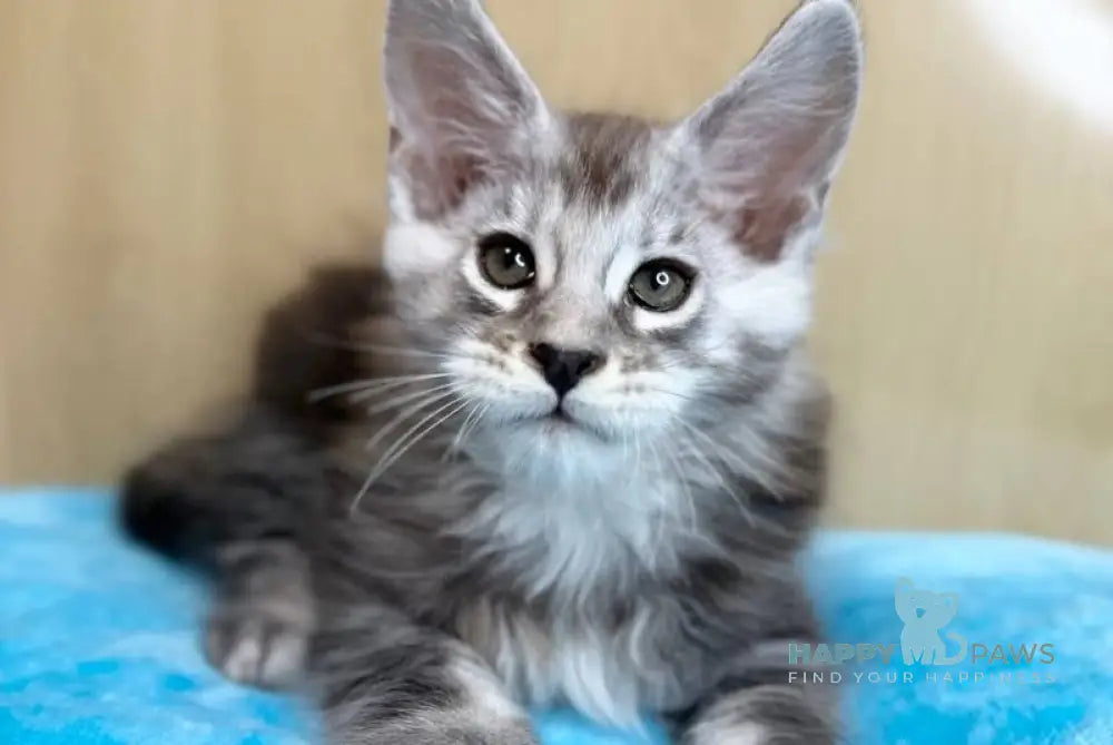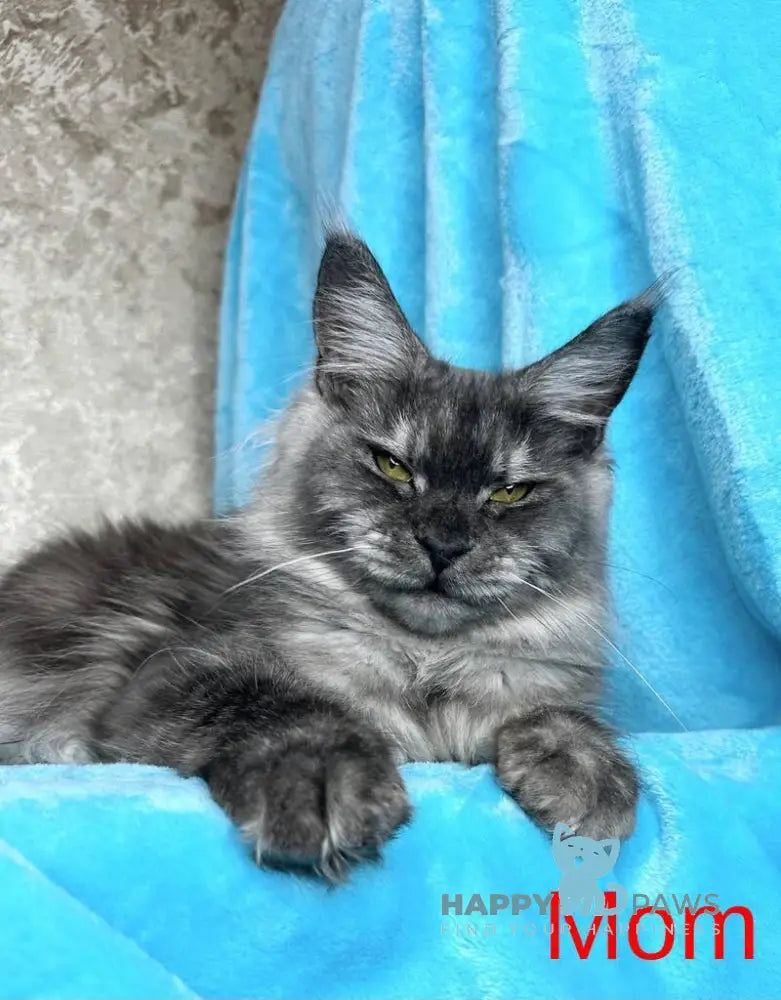 Zevs is a distinguished male Maine Coon with a striking black silver ticked tabby coat. This breed is renowned for its robust build, luxurious fur, and friendly temperament, making Zevs an excellent companion. His unique coloration highlights the classic Maine Coon’s tabby pattern with a distinctive silver undercoat, adding to his visual appeal and breed authenticity. Ideal for enthusiasts seeking a majestic and sociable feline with strong lineage.
