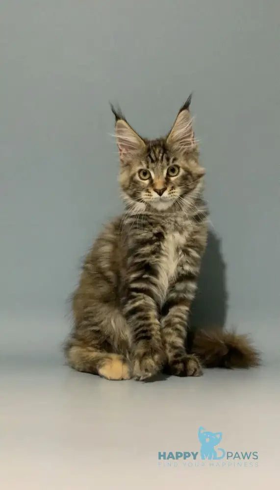 Zheneva is a striking female Maine Coon with a distinctive black tortie tabby coat pattern. Known for their large size and tufted ears, Maine Coons combine a majestic appearance with a gentle, intelligent temperament. Zheneva’s unique coloring enhances her natural beauty, making her an exceptional example of the breed. Ideal for those seeking a sociable, affectionate companion with a strong, regal presence.