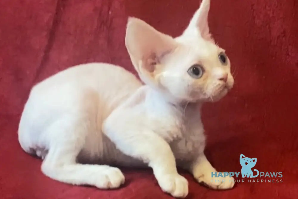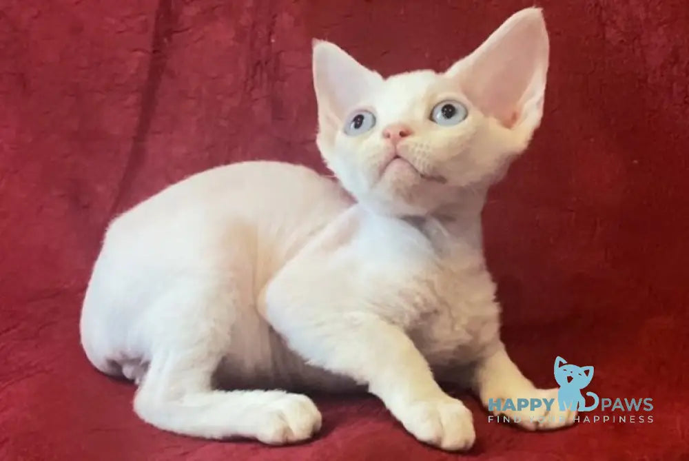 The Zorro Devon Rex male in white showcases the breed’s distinctive short, curly coat and slender, muscular build. Known for its playful and intelligent nature, this male cat offers an engaging companion with a unique appearance. Its soft, low-shedding fur makes it well-suited for those seeking an affectionate pet with minimal grooming needs. Ideal for experienced cat owners, this Devon Rex blends striking looks with a friendly, curious temperament.