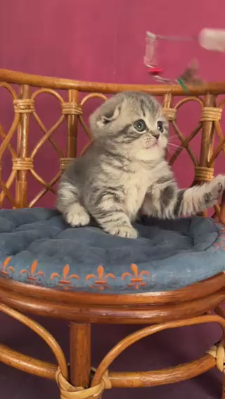 Zorya is a Scottish Fold female with a lovely blue tabby coat. Her delicate folded ears and soft markings give her a gentle, graceful look. She has a calm, affectionate nature and enjoys quiet companionship. Zorya brings a soothing presence wherever she goes.